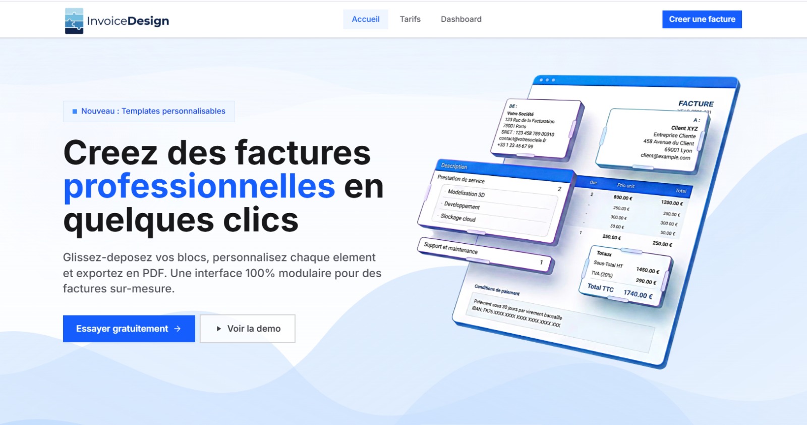 Créez des factures professionnelles en quelques clics grâce à une interface 100% modulaire. Glissez-déposez vos blocs, personnalisez chaque élément et exportez en PDF haute qualité.